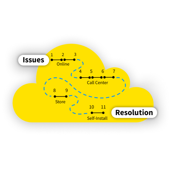 Drive Customer Service journeys, continuously from issue to resolution across channels, for ‘troubleshoot & resolve’ technical or commercial issues. Roojoom’s TS&R AI prediction capability fast forwards the journey to reduce resolution times and improve First-Time-Right rates, with coding-free auto-generated UX.
